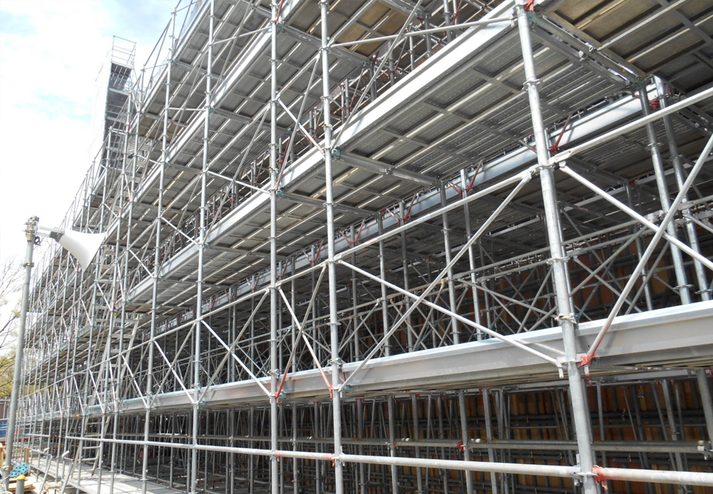 地上から直接足場を建てられない場合に、躯体に取り付けて足場を構築するために張り出し足場の支持台として利用可能。